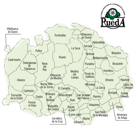 No se encuentra, a 2001-05-14, documentación en Internet en la que se indiquen los municipios que se incluyen en las distintas y variadas denominaciones de origen utilizadas en España (tanto de vinos como de otros productos), algo extraño dada la importancia de las localidades de origen en las denominaciones. La excepción ha sido la página de la Unión Europea. Hay 3 acuerdos de la Unión Europea, del año 1993, que indican los municipios para los vinos de los siguientes países: Alemania, Francia, España, Grecia, Italia y Luxemburgo. Dada la escasez de esta información, se ha incluido uno de ellos en esta página ("Acuerdo entre la Comunidad Europea y la República de Bulgaria sobre la protección y el control recíprocos de las denominaciones de vinos"). Las cantidad de municipios citados es aproximadamente la indicada en el mapa anterior. Nota: A 2002-09-01, la información de los municipios se encuentra en la página de la DO Rueda. |